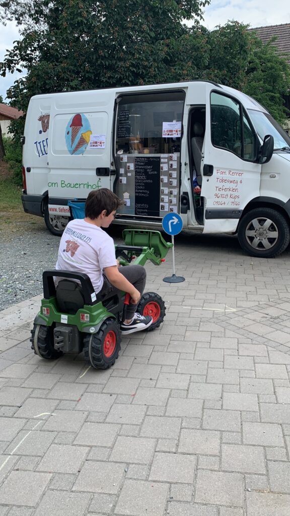 Jeden Sonntag öffnet unser Eisbauernhof seine Tore für euch und ihr dürft hinter die Kulissen schauen. Bei einem Hofspaziergang durch unsere Kuhställe könnt ihr einen Eisbecher schlemmen. Unsere braven Kälbchen und Kühe freuen sich über Streicheleinheiten und für alle kleinen Besucher gibt es ganz viele Schaufeln und Besen -denn: Es gibt hier IMMER was zu tun :). Außerdem warten unsere Trampelbulldogs und unser Sandkasten darauf, bespielt zu werden. An unserer Holzkuh könnt ihr das Melken lernen.